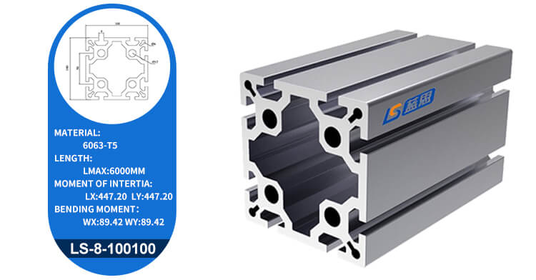 Los perfiles de aluminio industriales de la serie 100 son materiales de marco de gran sección y alta carga, el tamaño del perfil es de 100 × 100 mm, el ancho de la ranura es de 10 mm, se pueden usar para el ensamblaje del marco con requisitos de alta capacidad de carga, pero debido al gran peso de el perfil, el precio de los perfiles de aluminio también es más alto que otras especificaciones de materiales.